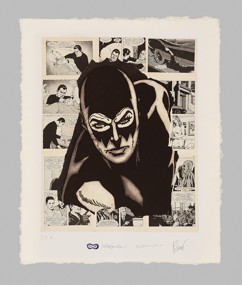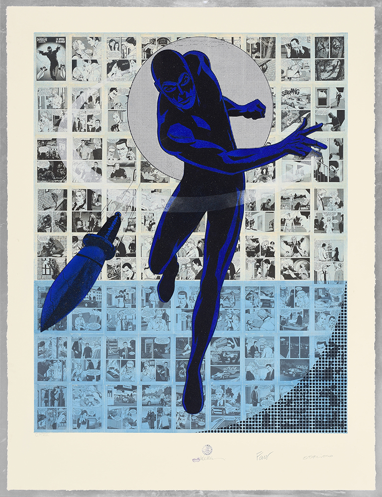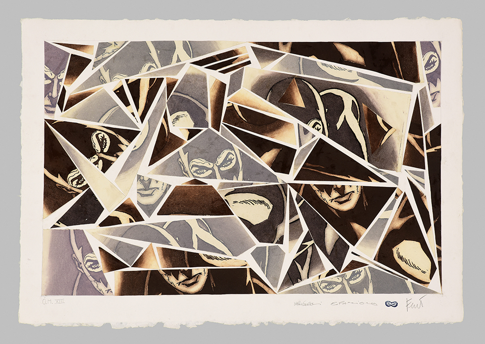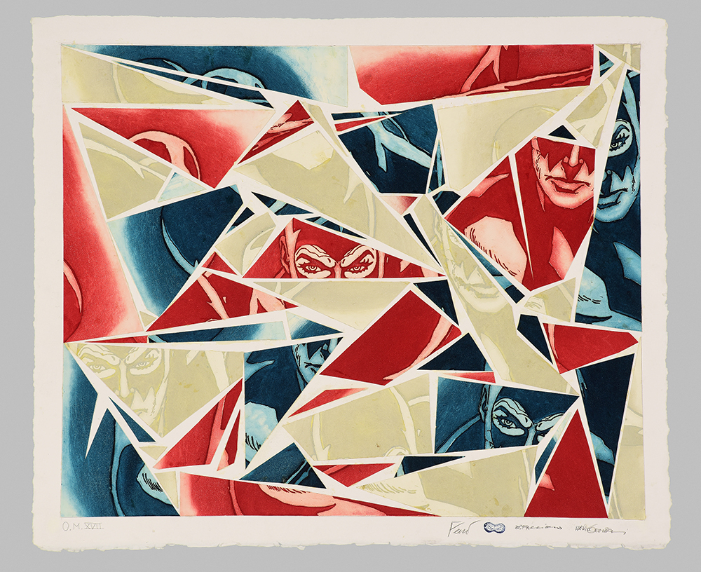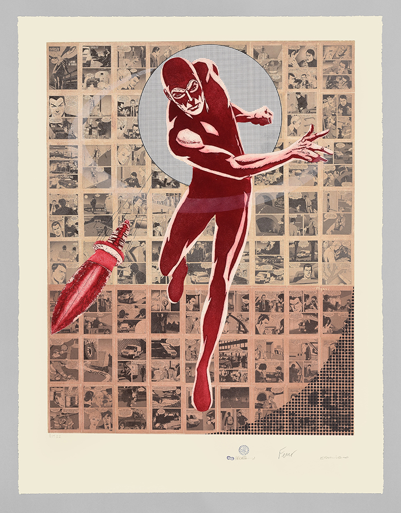Etching and aquatint on collage of original comics, silk-screen printing, tempera interventions.