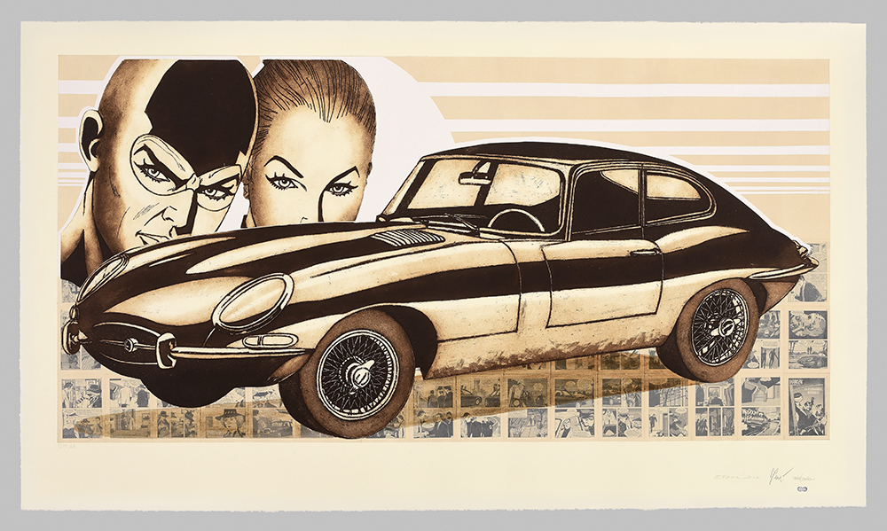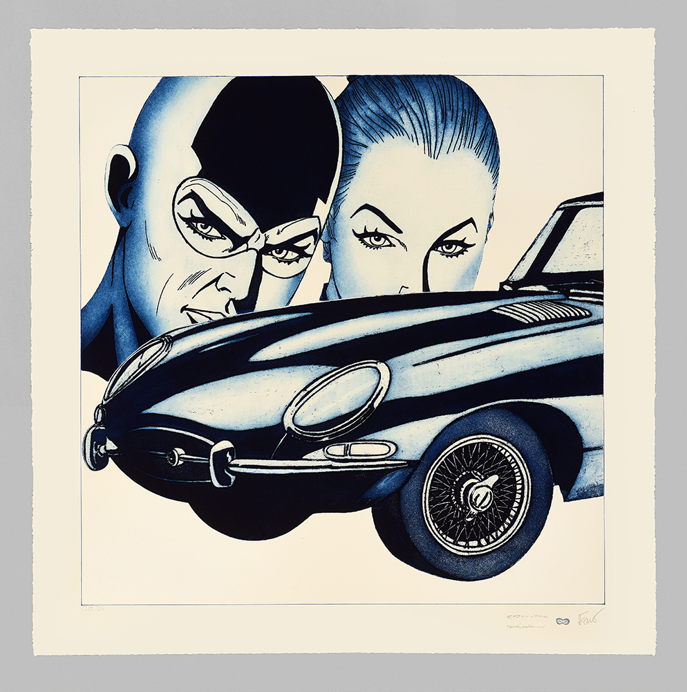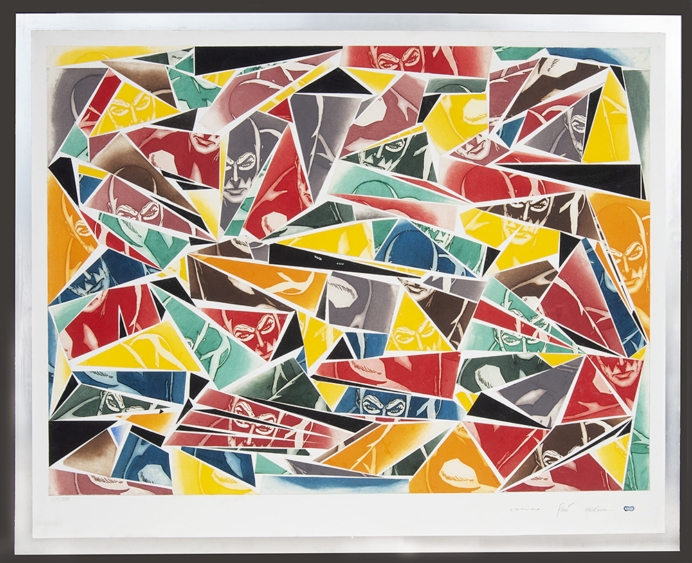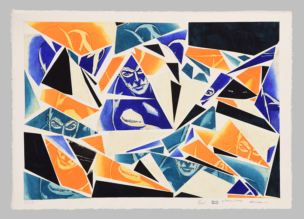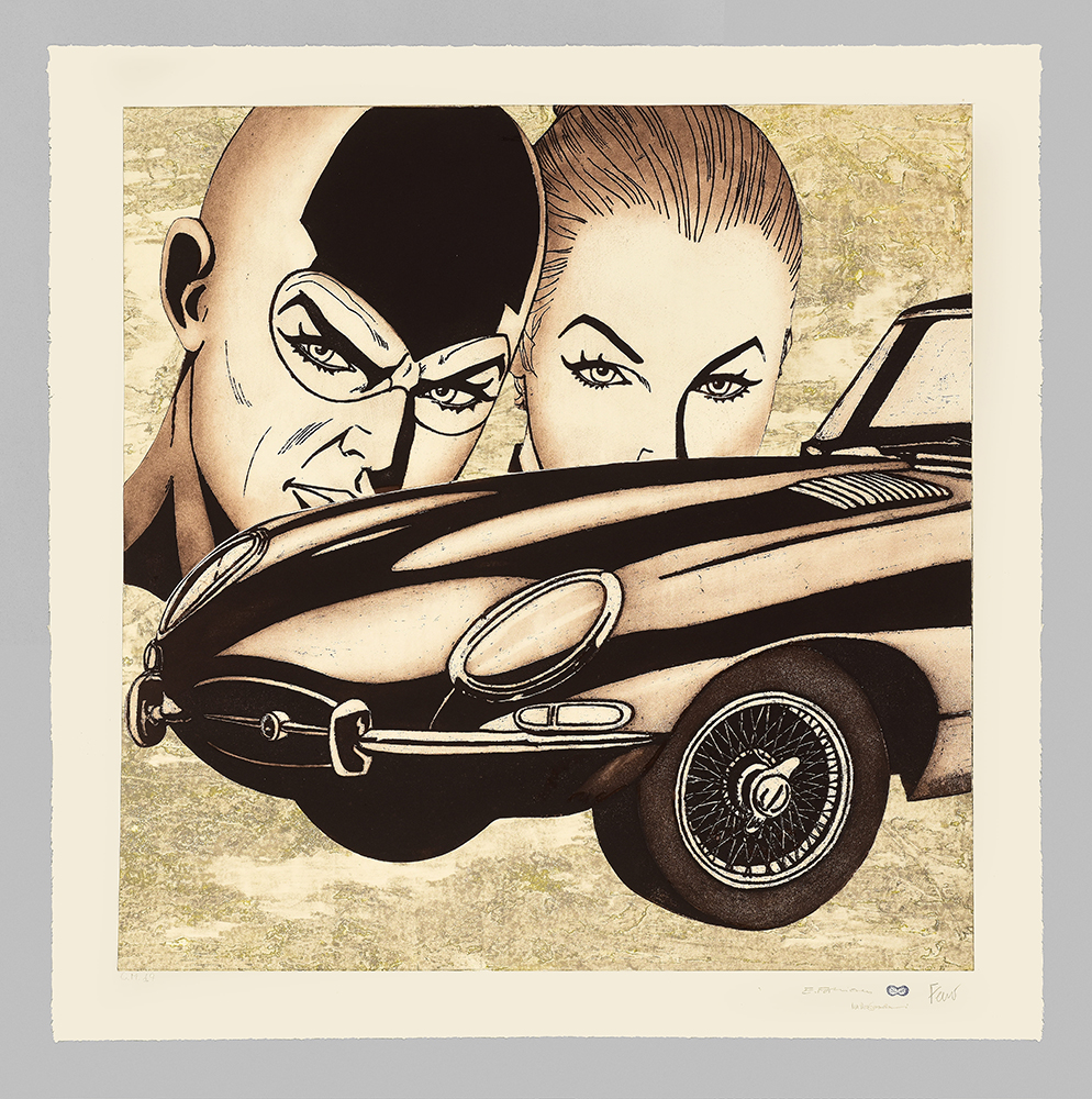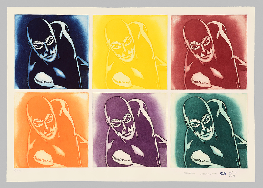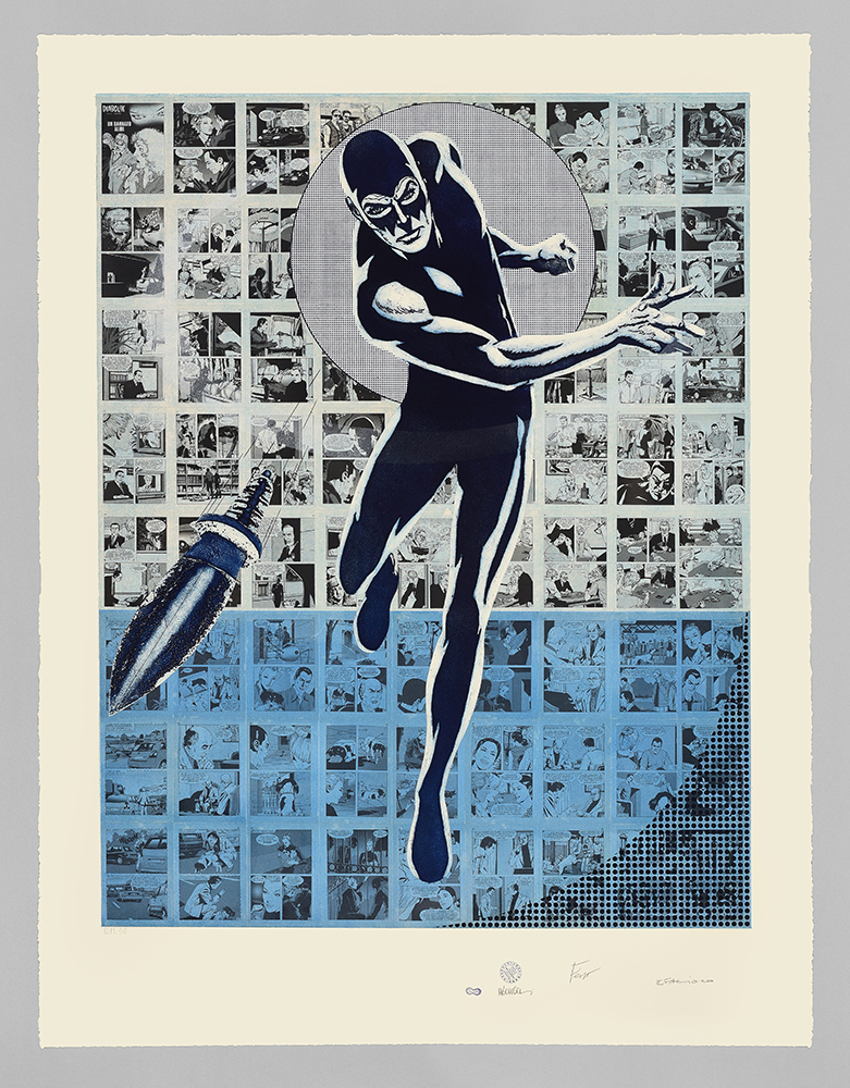 Aquatint base on original comics collage, screen printing, figure in etching and aquatint, stippling in carborundum screen printing.