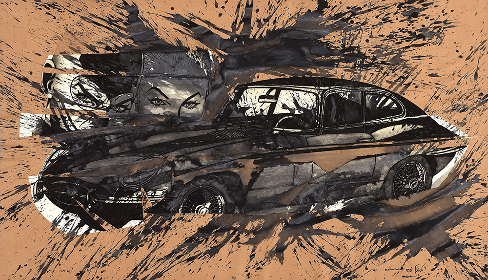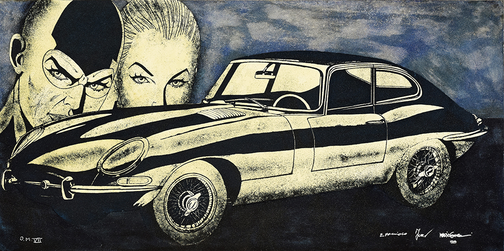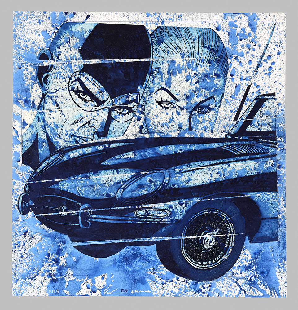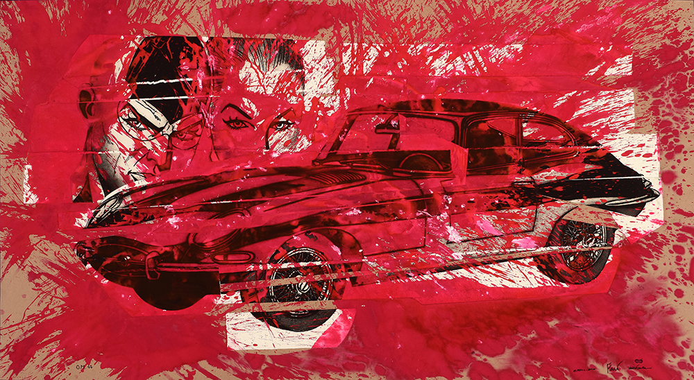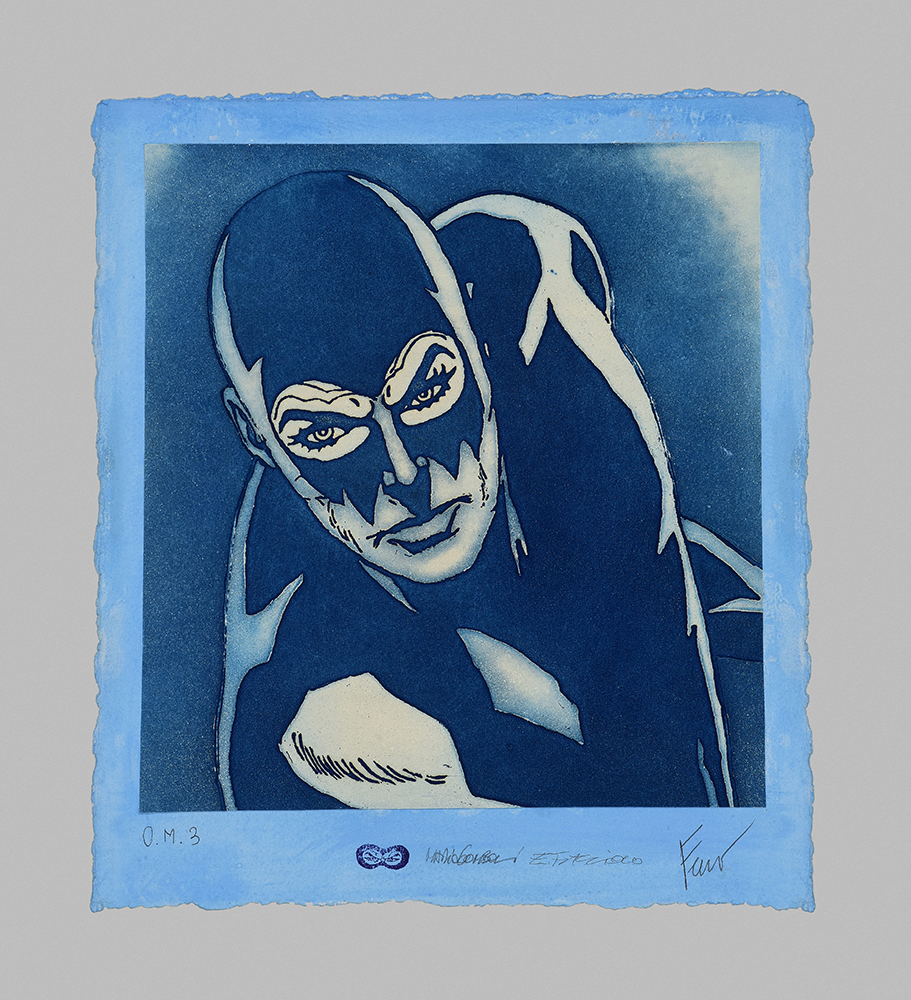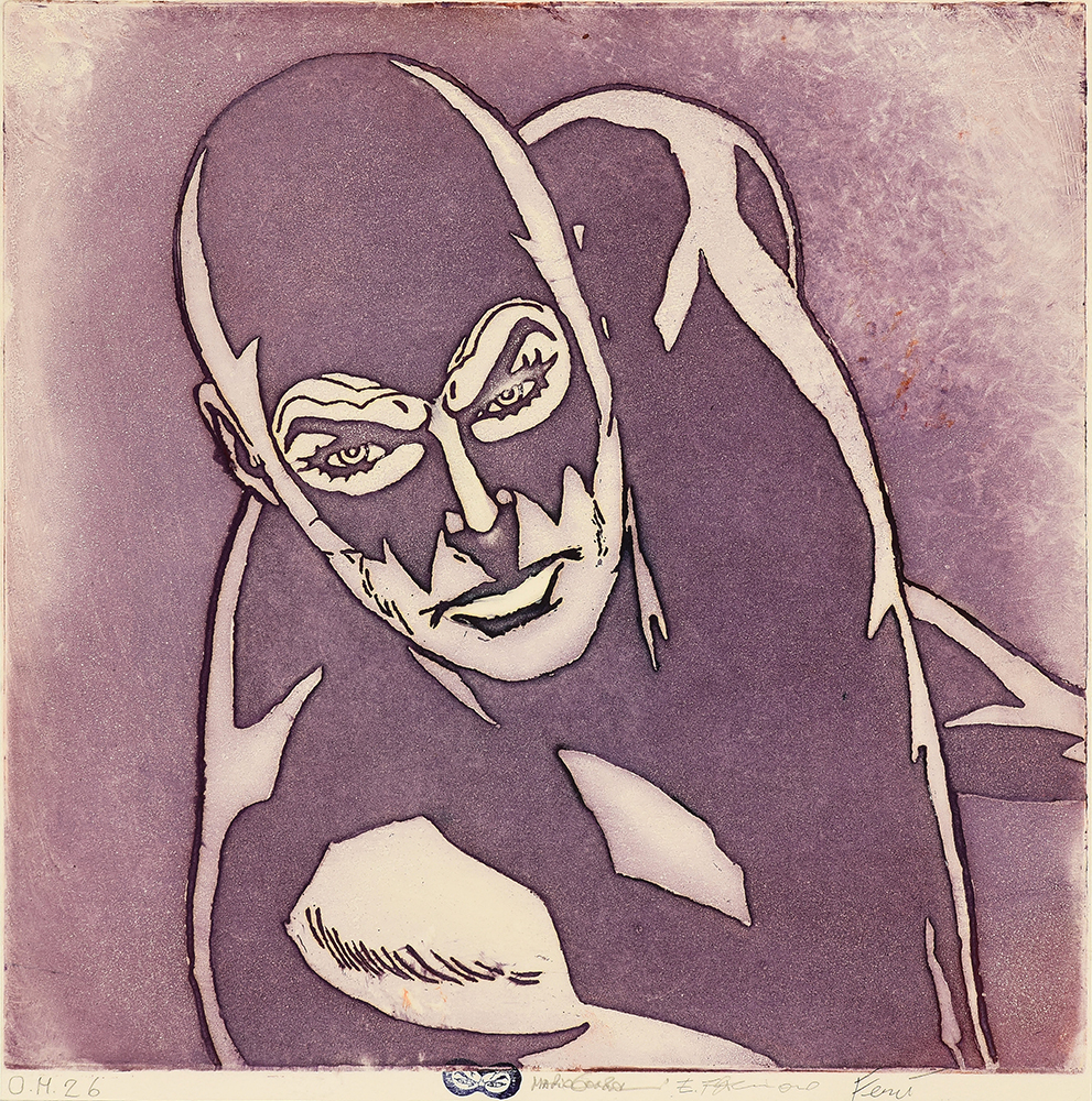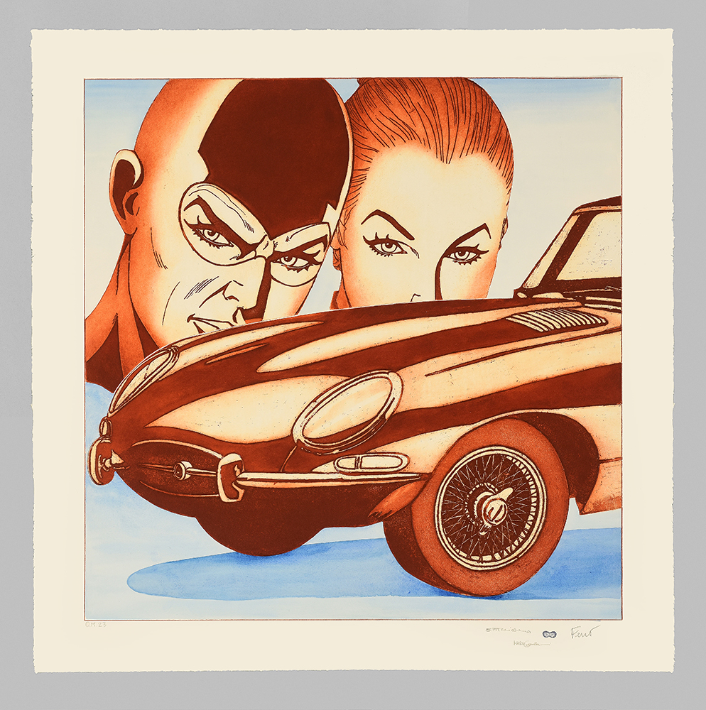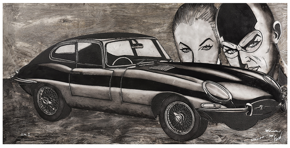 Aquatint base on original comics collage, screen printing, figure in etching and aquatint, stippling in carborundum screen printing.