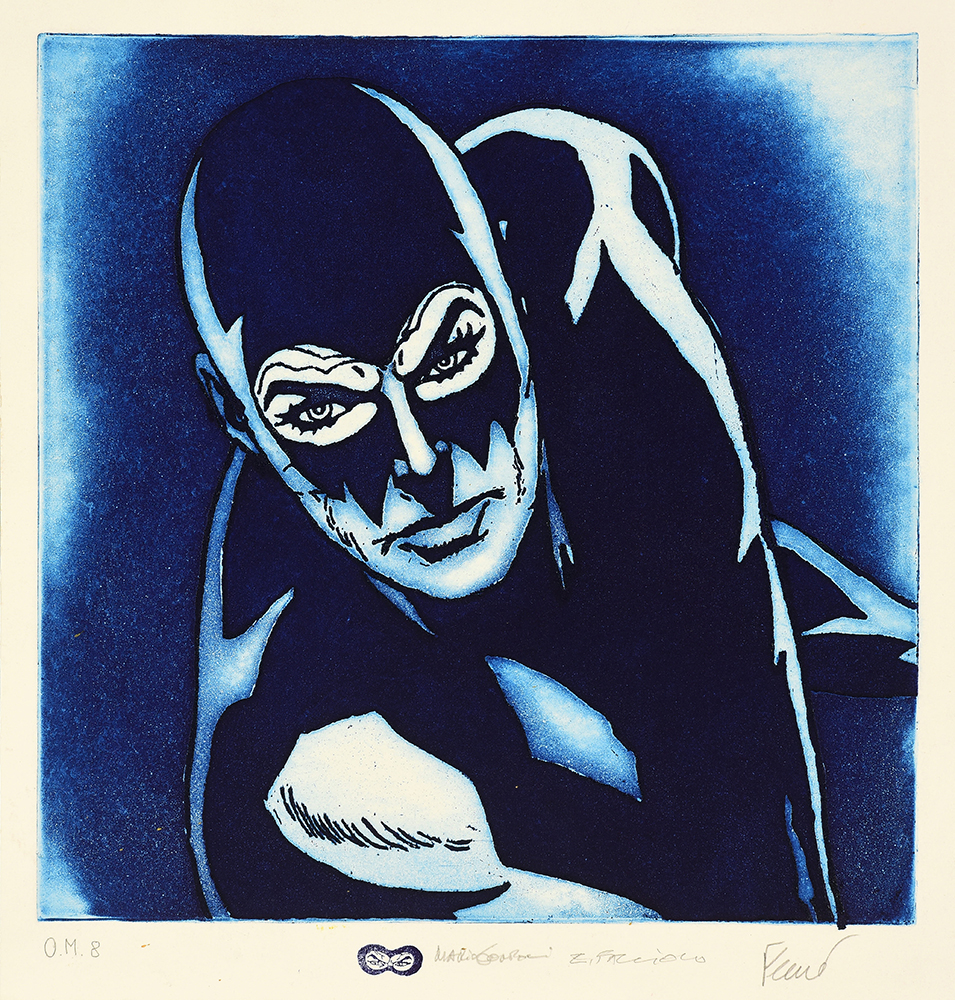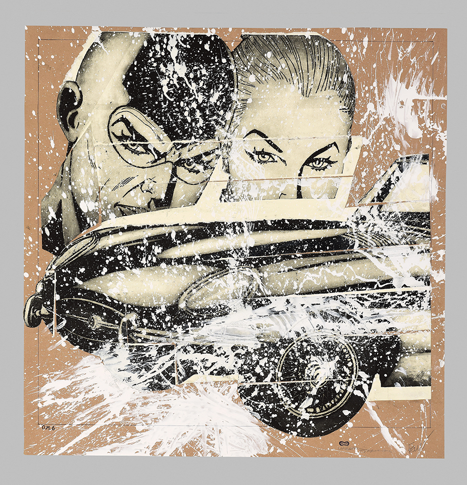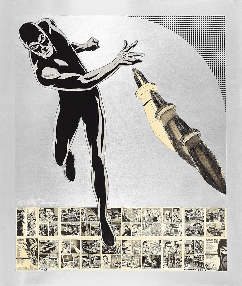 Chalcographic shaped matrix in iron, worked with etching and aquatint, glued on collage of original comics with overprinted aquatint base and stippling screen printing.