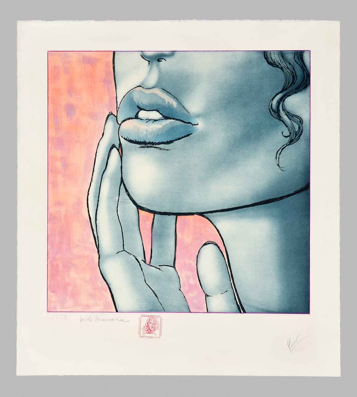Tecnica: Acquaforte, acquatinta a due matrici, fondo ed interventi a mano con polvere d’argento e acquerello.