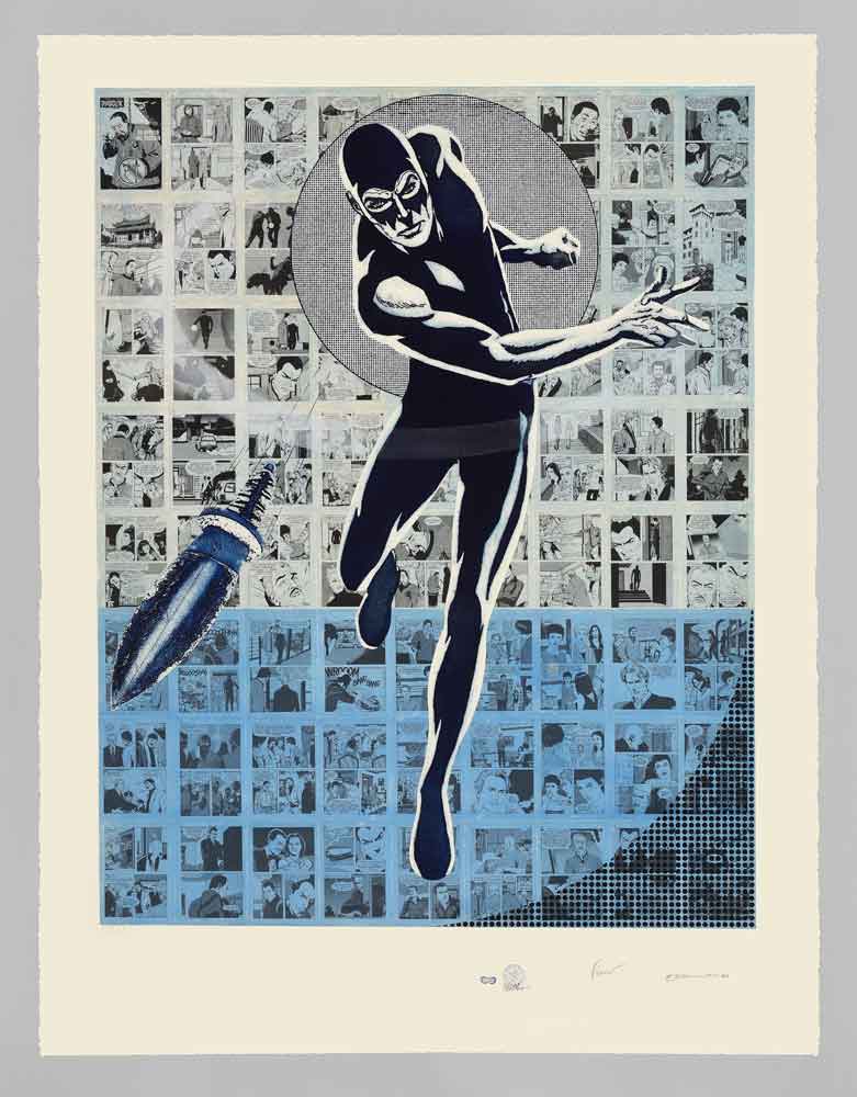tecnica: Fondo acquatinta su collage di fumetti originali, serigrafia, figura in acquaforte e acquatinta, retini in serigrafia al carborundum grigio.