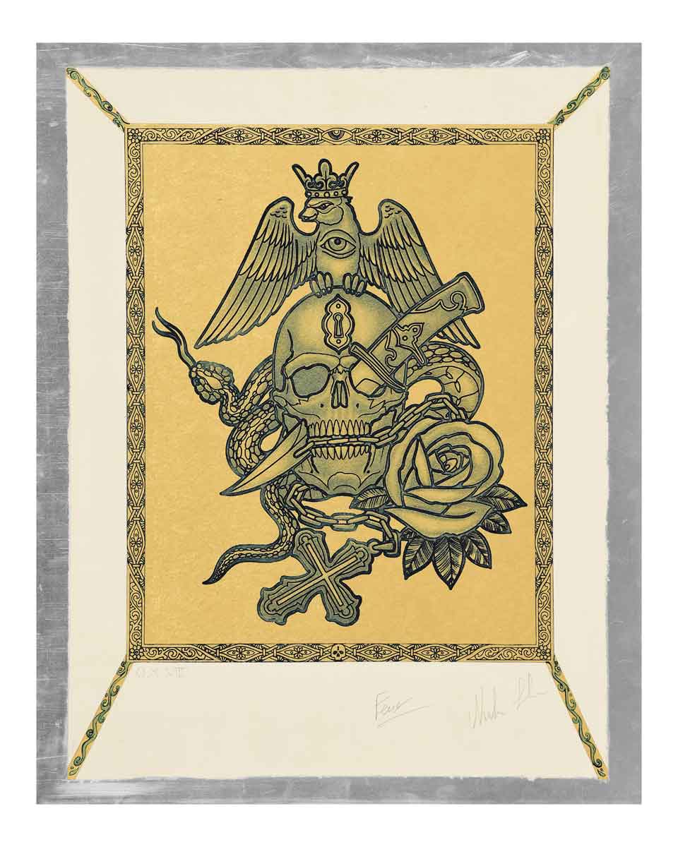 titolo: Il Segreto della Felicità anno: 2021 supporto: Lastra in alluminio L cm 55,5 x H cm 70 stampa: Luce di stampa L cm 39,5 x H cm 49. Matrice in rame L cm 50 x H cm 65 tecnica: Acquaforte e acquatinta, colore blu, su carta dorata, con interventi ad acquerello sulla cornice