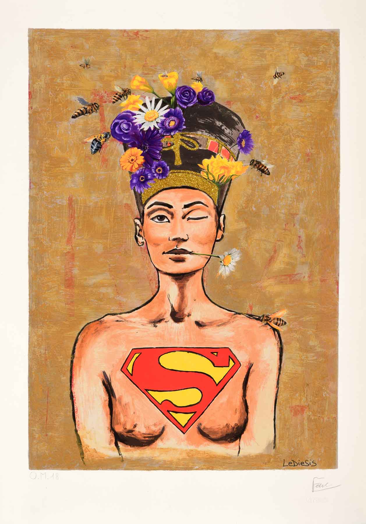 tecnica: Serigrafia su carta Hahnemühle 350 gr., decorata a mano con interventi in polvere d’oro, colori a tempera, con particolari dipinti a rilievo, realizzati con glitter, vernice acrilica.