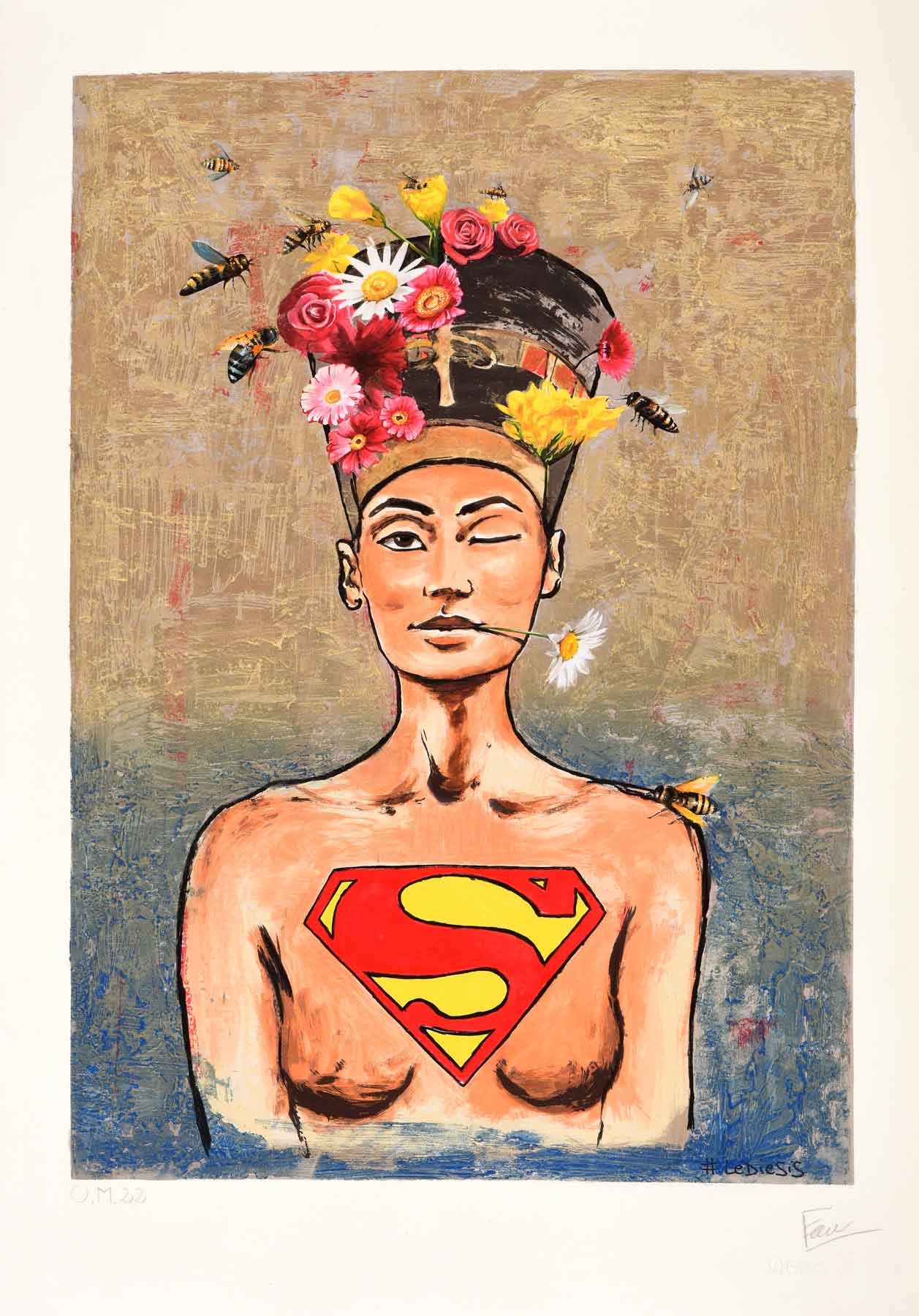 #Lediesis titolo: La regina delle api anno: 2021 supporto: Carta Hahnemühle 350 gr. L cm 63 x H cm 88,5 Luce di stampa: L cm 52 x H cm 74 tecnica: Serigrafia su carta Hahnemühle 350 gr., decorata a mano con interventi in polvere d’oro, colori a tempera, con particolari dipinti a rilievo, realizzati con glitter, vernice acrilica.