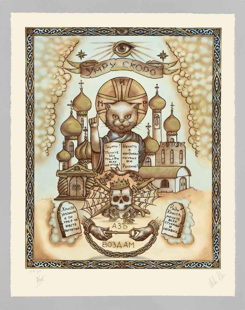 tecnica: Acquaforte, acquatinta, colore terra d’ombra bruciata, fondo e interventi a mano con polvere d’oro e acquerello.