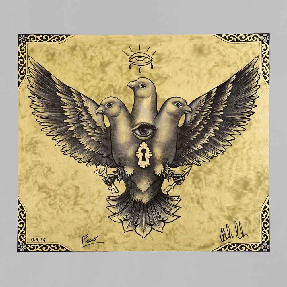 tecnica: Acquaforte, acquatinta su carta Hahnemühle 350 gr. sagomata e incollata su lastra di alluminio, decorata con interventi in foglia d’oro, fondo dipinto con smalto dorato per vetro.