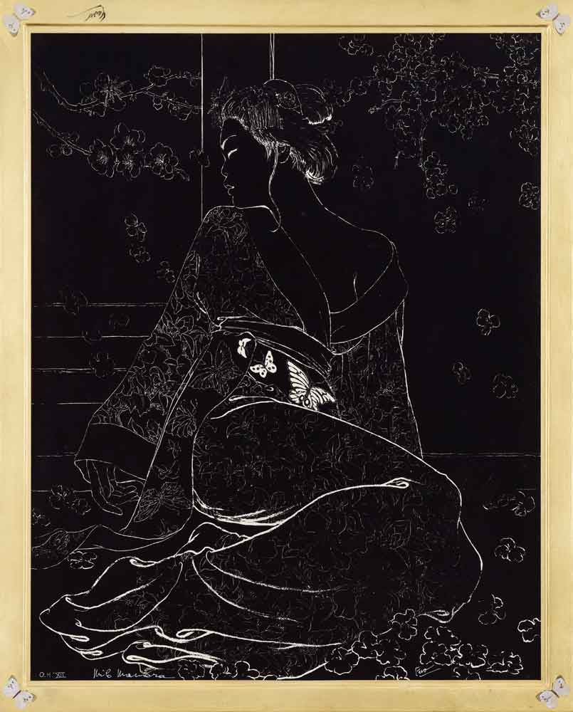 Titolo: Madame Butterfly Anno: 2022 Supporto: Tavola di legno L cm 86 x H cm 107 Stampa: Luce di stampa L cm 75 x H cm 96 Matrice in ottone L cm 75 x H cm 100 Tecnica: Serigrafia in negativo stampata su foglio di carta Hahnemühle 350 gr. incollata su tavola per icone in legno di tiglio con imprimitura a gesso, dipinta e decorata con polvere d’oro e colori ad olio.