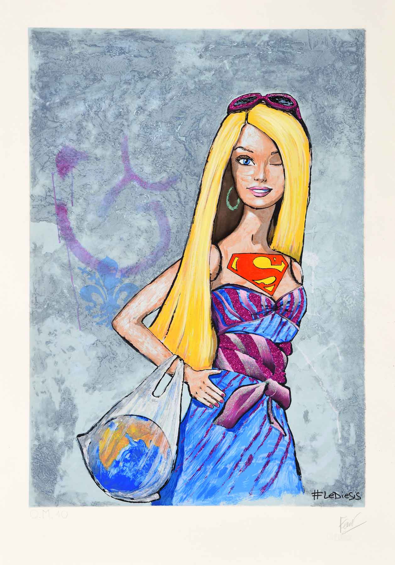 tecnica: Serigrafia, rilievografia su carta Hahnemühle 350 gr., fondo e interventi a mano con glitter, colori a tempera e vernice acrilica.