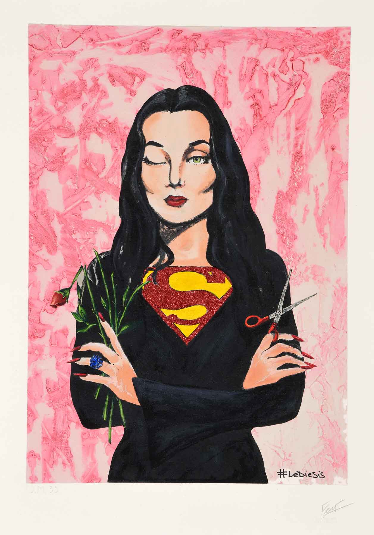 tecnica: Serigrafia, rilievografia su carta Hahnemühle 350 gr., fondo e interventi a mano con glitter/ polvere metallica/ colori a tempera / smalto per vetro / vernice acrilica.