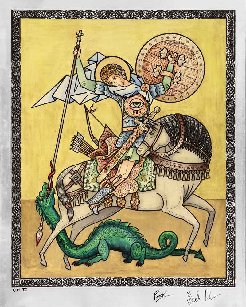 titolo: San Giorgio flagellatore dei traditori anno: 2021 supporto: Lastra di alluminio L cm 93 x H cm 117 stampa: Luce di stampa L cm 85 x H cm 105 tecnica: Serigrafia a carborundum nero con fondo e interventi a mano in polvere d’oro zecchino e acquerello, verniciata.